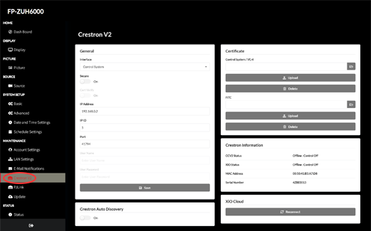 通过导航菜单的 MAINTENANCE(维护)栏目,选择“Crestron® V2”。