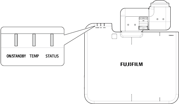 Projector status is shown by whether the indicator (ON/STANDBY, TEMP, and STATUS) lamps are on, flashing, or off.