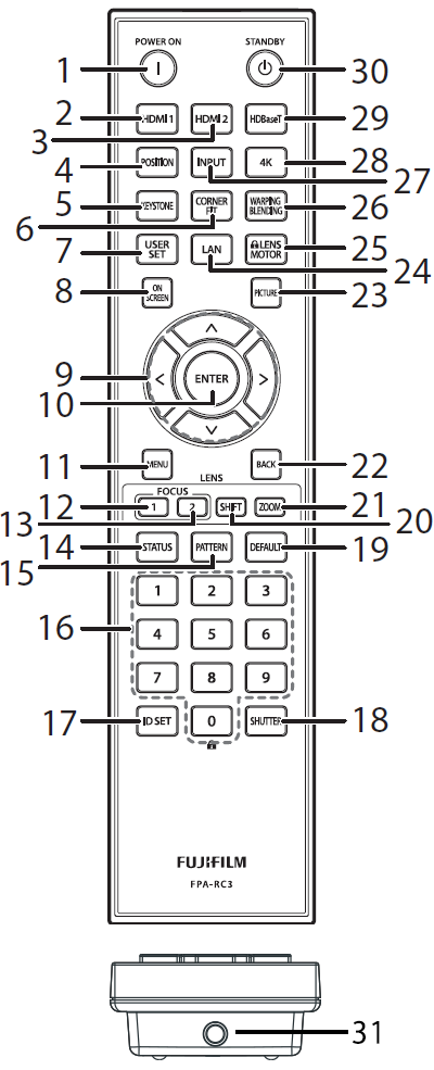 16 | 10-key pad | Press and hold this button for four second to disable remote operation. Be sure a aim the remote at remote receiver when performing this operation. This setting can only be adjusted using the remote control. | |