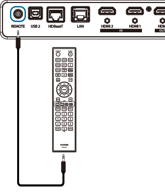 Connect the remote control’s remote output terminal to the projector’s remote input terminal using a commercially available m3 stereo mini jack cable.