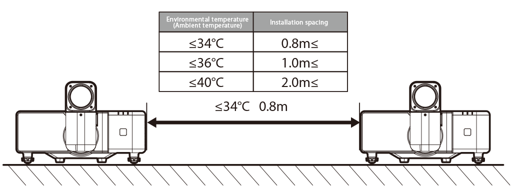 When installing two or more projectors side-by-side, Please maintain installation spacing suitable for the environmental temperature (the ambient temperature). You will also need to ensure that the warm air from the exhaust vent does not enter any of the projectors’ intake vents.