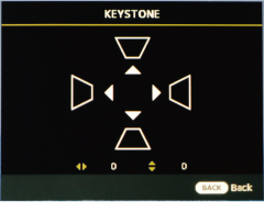 Press ENTER to display the keystone compensation dialog and use the selector (up, down, left, and right) to correct keystone distortion.