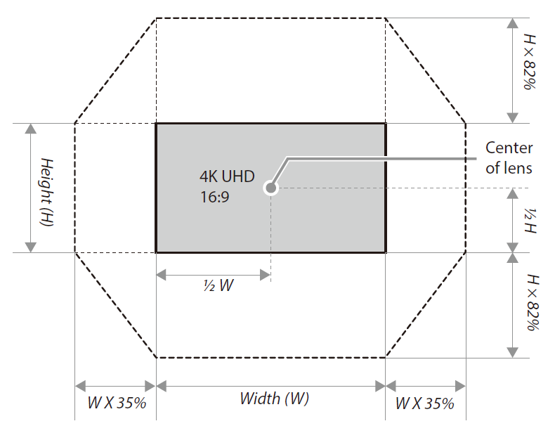 Screen dimensions (16∶10) | A Projection distance (cm/in.) min.–max. zoom |