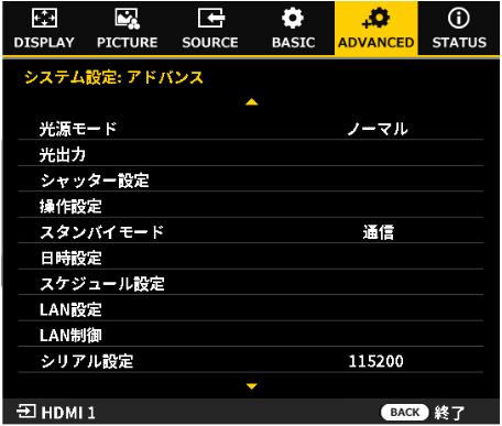 AMX® Device Discovery | オンにすると、AMXデバイスを使ってプロジェクターを制御します。この機能を無効にするには、オフを選びます。 |