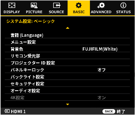 - パネルキーでオフを選択すると、バックライト機能が無効になり、オンを選択すると、プロジェクターの電源がオフになるまで、操作パネルのバックライトが点灯したままとなります。
